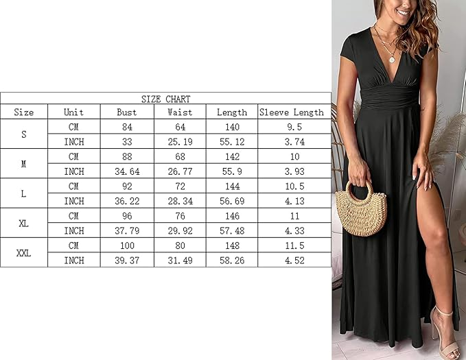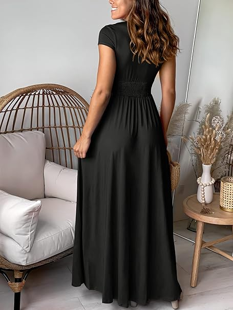Abiti a maniche corte a V delle donne, A-Line, vita alta, orlo della sirena spaccato, tinta unita, sfoderato, questo abito Maxi delle donne può mostrare la vostra figura meglio.
